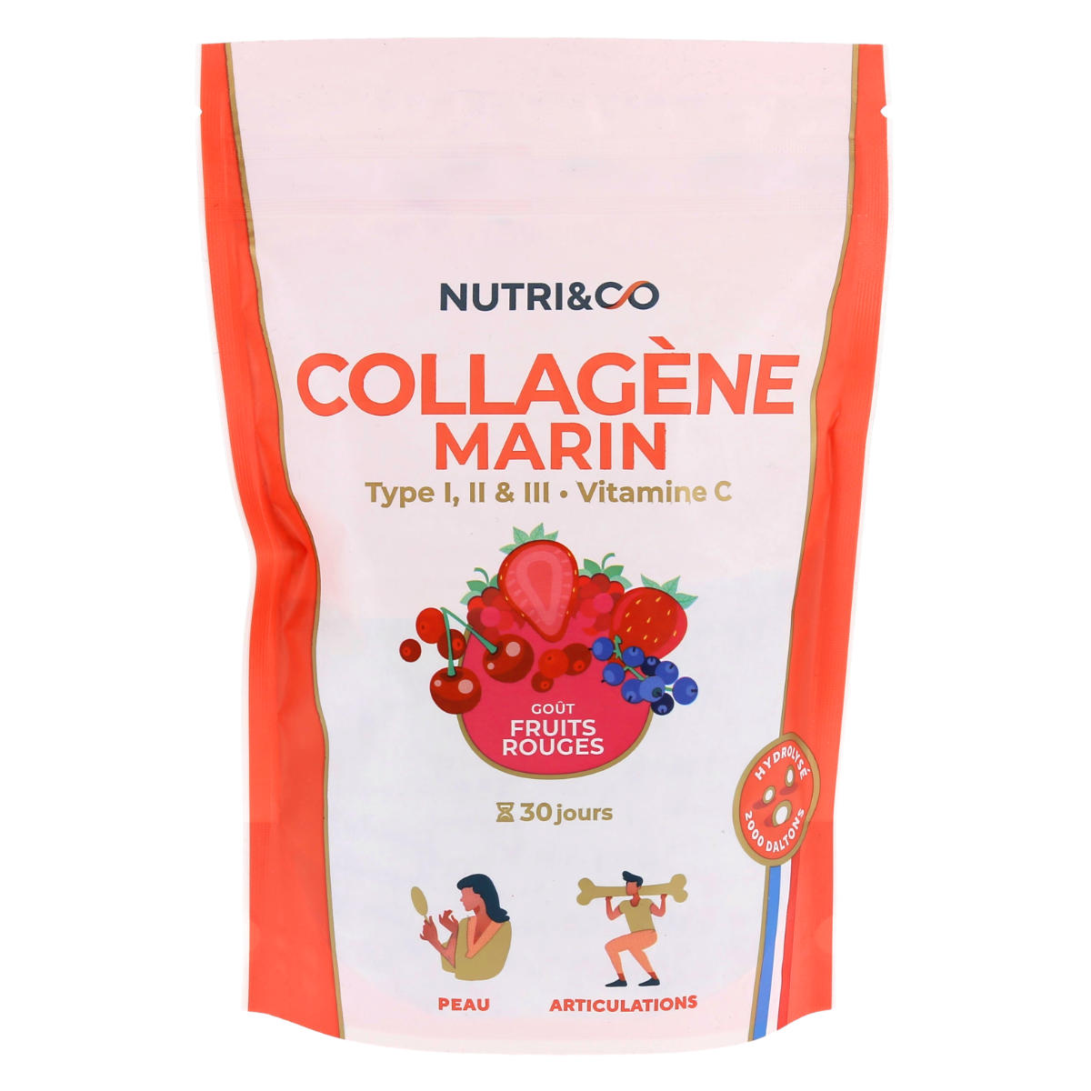 Nutri&Co Collagène Marin Type I,II &III/Vitamine C, Hydrolysé 2000 Daltons, Peau/Articulations, goût fruits rouges, sachet de 180g