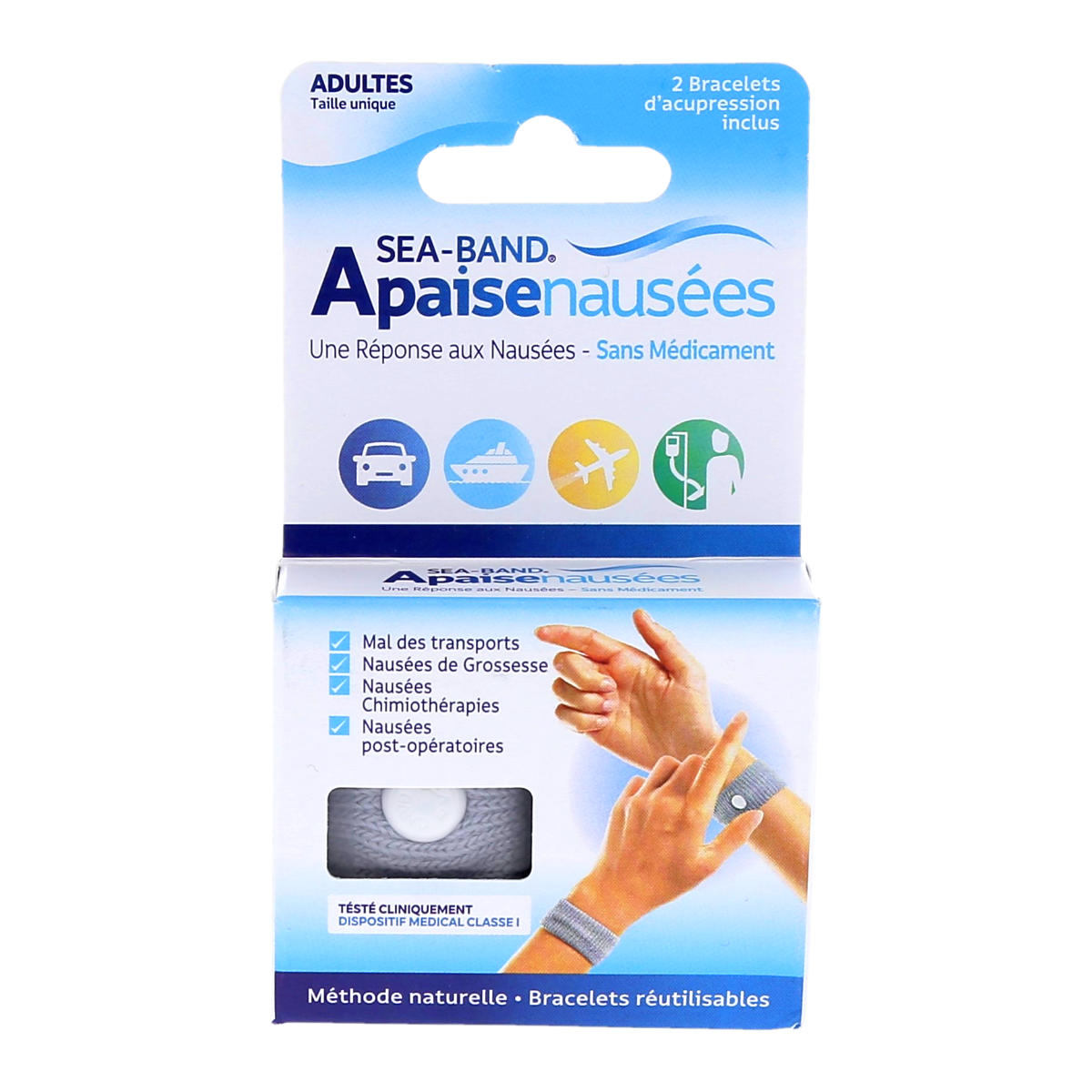 Sea Band Adultes Apaisenausées Paire de Bracelets d'Acupression - Couleur : Gris sont des bracelets d'acupression qui apaisent et soulagent sans médicament les nausées et les vomissements liés au mal des transports. Ils soulagent également les nausées et vomissements post-opératoires et post-chimiothérapies. Ils peuvent s'utiliser même si les nausées ont déjà débuté. Leur efficacité est cliniquement prouvée. Sans aucune contre-indication connue, ils peuvent s'utiliser seuls ou associés à des traitements médicamenteux. Ils sont confortables, réutilisables, adaptés à la majorité des tailles de poignets et lavables à la main.