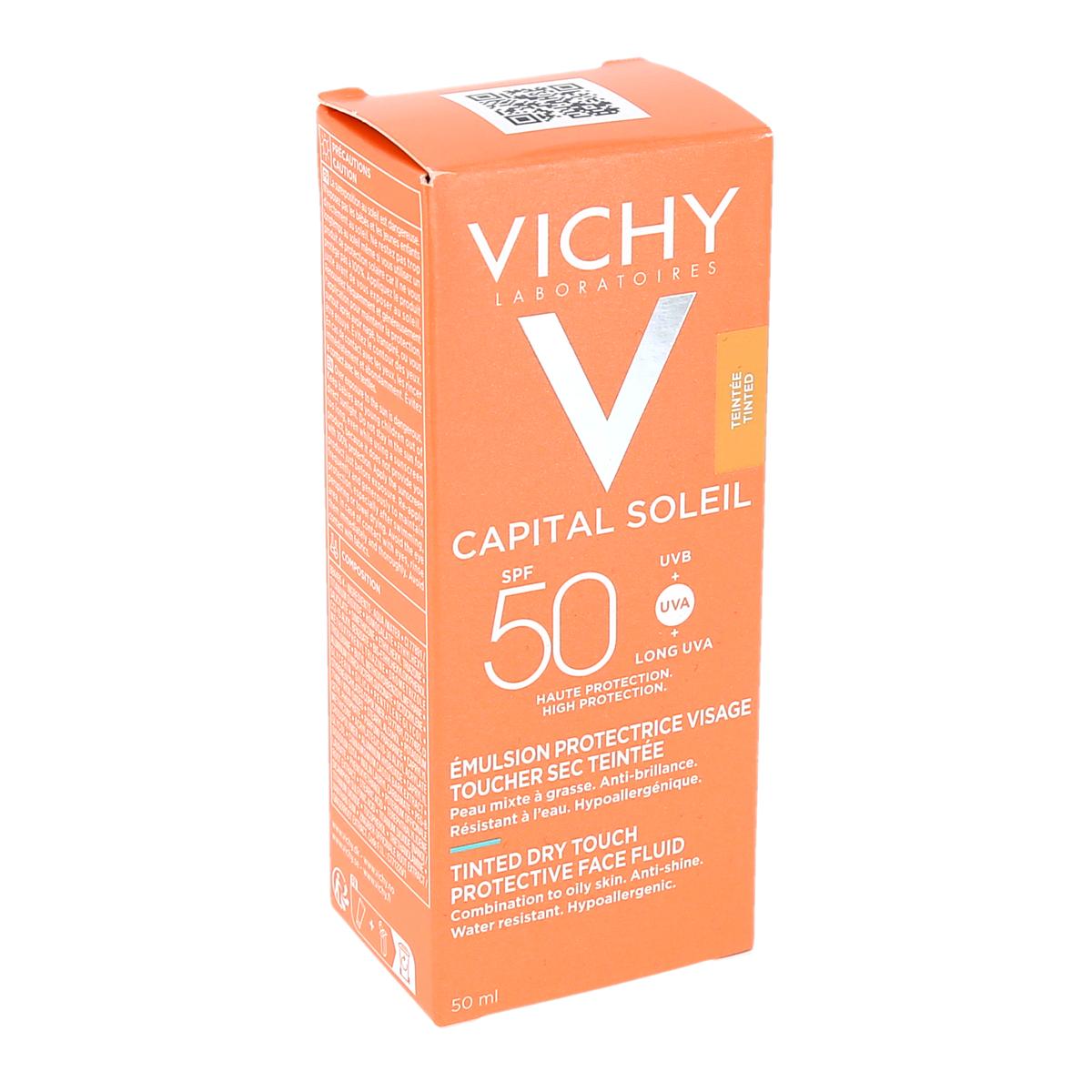 Vichy Capital Soleil Emulsion Protectrice Visage SPF50, Toucher sec teinté, peaux mixtes à grasses, tube de 50ml