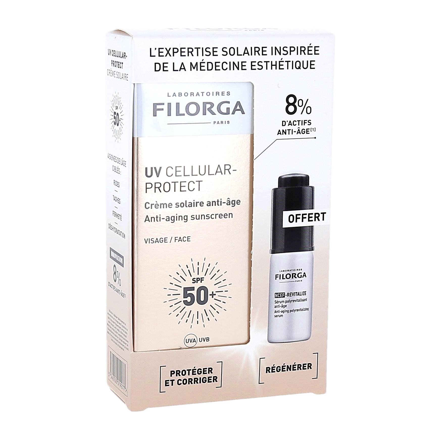 Filorga UV Cellular-Protect Crème Solaire anti-âge SPF50+, Visage, 1 tube de 40ml + 1 Filorga NCEF-Revitalize Sérum de 5ml offert